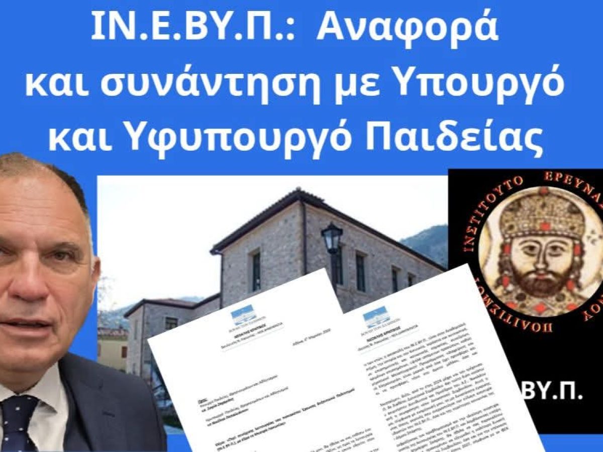 Το αδιέξοδο στο οποίο έχει περιέλθει το Ινστιτούτο Έρευνας Βυζαντινού Πολιτισμού (ΙΝ.Ε.ΒΥ.Π.) κοινοποιεί στην Υπουργό Παιδείας κα. Σοφία Ζαχαράκη ο κ. Νεοκλής Κρητικός, μέσω νέας Αναφοράς. Σημειώνεται, πως λόγω της ιδιαιτερότητας και σοβαρότητας του θέματος, προηγήθηκε αναλυτική επιστολή προς την Υπουργό και τον Υφυπουργό, αρμόδιο για την Ανώτατη Εκπαίδευση, κ. Νίκο Παπαϊωάννου.