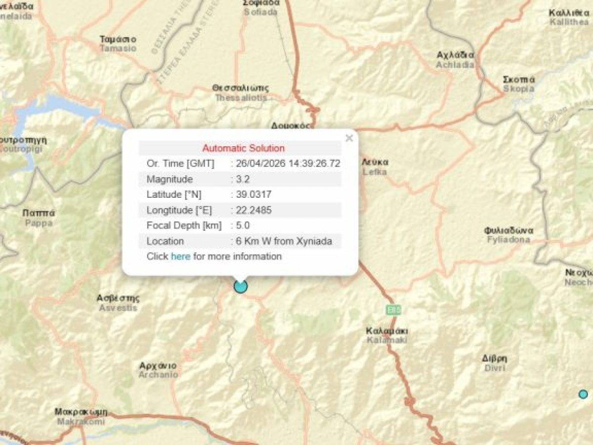 Σεισμός μεγέθους 3,2 βαθμών της κλίμακας Ρίχτερ σημειώθηκε στις 17:40 το απόγευμα, με επίκεντρο 6 χλμ. νοτιοδυτικά της Ξυνιάδας Δομοκού.