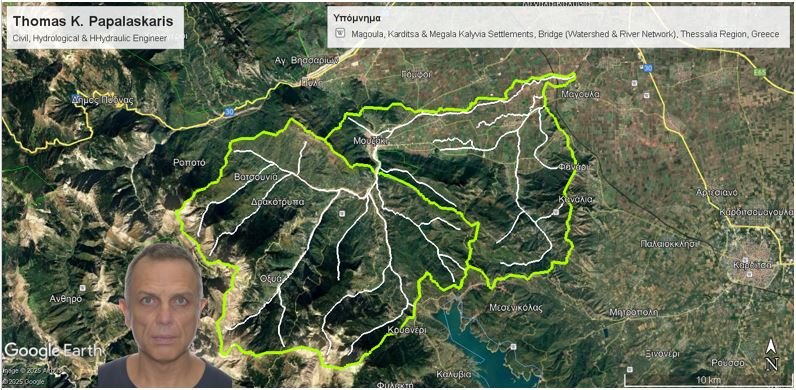 Παρατήρηση: Το παρόν δημοσίευμα θα αναμορφωθεί όταν, έπειτα από προσωπική έρευνα στο διαδίκτυο, επεξεργαστούν από τον συγγραφέα του παρόντος και τα υπόλοιπα διαθέσιμα στοιχεία των: 1).“βροχοπτώσεων της ευρύτερης περιοχής”, 2).“αναλυτικών χρήσεων γης της ευρύτερης περιοχής” (έτσι ώστε να καθοριστεί ο ακριβής “curvenumber”), 3).“γεωλογικάστοιχεία της ευρύτερης περιοχής“ (έτσι ώστε να καθοριστεί ο ακριβής “curvenumber”), που αφορούν την περιοχή της “λεκάνης απορροής”, (που αντιστοιχεί έως το σημείο όπου έχει κατασκευαστεί η «Γέφυρα Μαγούλας, Καρδίτσας και Μεγάλων Καλυβίων, Τρικάλων» [του «Δήμου Μουζακίου», της/του «Π.Ε. (Νομού)Καρδίτσας» και του «Δήμου Τρικκαίων» της/του «Π.Ε. (Νομού) Τρικάλων» αντίστοιχα), του «Ποταμού Πάμισου», ενώ, επιπρόσθετα η παρούσα, (αποκλειστικά ιδιωτική και υποκειμενική), μελέτη εκπονήθηκε δωρεάν (και δόθηκε ανοιχτά στην δημοσιότητα) και δεν έχει επιδοτηθεί, (ούτε με ένα ευρώ), από κανένα είτε Εθνικό είτε Ευρωπαϊκό οικονομικό πόρο ή άλλη Υπηρεσία είτε Οργανισμό. Τέλος, τα πραγματικά δεδομένα βροχοπτώσεων, αφορούν, αποκλειστικά, τον μετεωρολογικό σταθμό της «“Οξυάς”, του “Δήμου Μουζακίου”, της/του “Π.Ε. (Νομού)Καρδίτσας”», (αθροιστική βροχόπτωση ίση με «186,80mm»), όπως αυτά ανακοινώθηκαν από την ιστοσελίδα “meteo.gr” και αφορούσαν το χρονικό διάστημα «03-08/12/2025» [6.1-6.12,7.1-7.2].