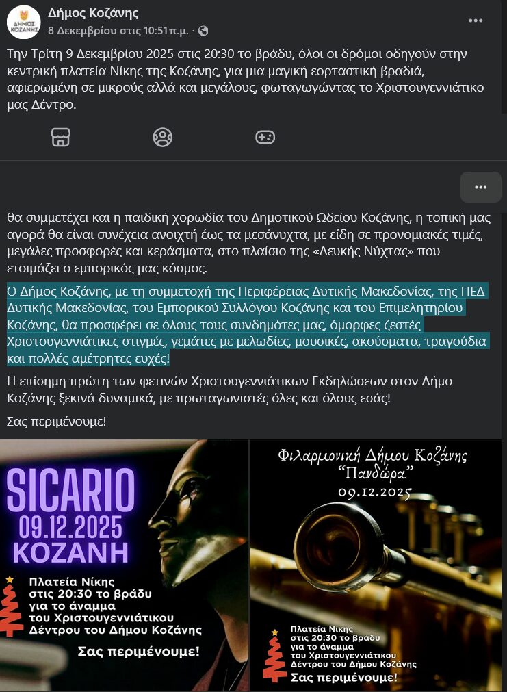 «Ο Δήμος Κοζάνης, με τη συμμετοχή της Περιφέρειας Δυτικής Μακεδονίας, της ΠΕΔ Δυτικής Μακεδονίας, του Εμπορικού Συλλόγου Κοζάνης και του Επιμελητηρίου Κοζάνης, θα προσφέρει σε όλους τους συνδημότες μας, όμορφες ζεστές Χριστουγεννιάτικες στιγμές, γεμάτες με μελωδίες, μουσικές, ακούσματα, τραγούδια και πολλές αμέτρητες ευχές!».
