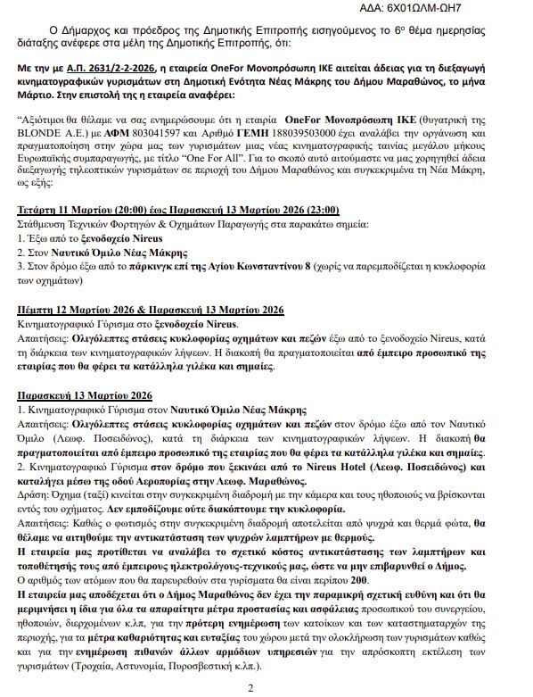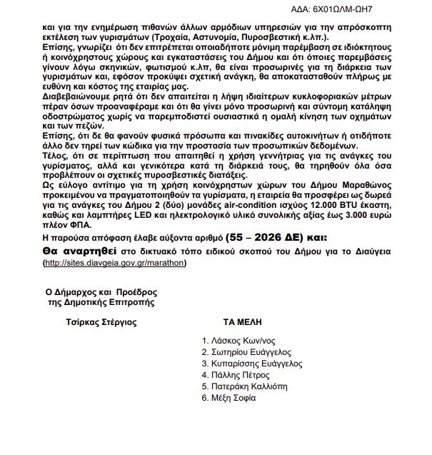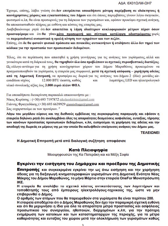 Το πρόγραμμα των γυρισμάτων, τις απαιτήσεις της εταιρείας παραγωγής καθώς και τις λεπτομέρειες της συμφωνίας της με τον δήμο Μαραθώνος για να φιλοξενηθούν στην περιοχή μας τα γυρίσματα της ταινίας The Riders με πρωταγωνιστή τον Μπραντ Πιτ, είδαν το φως της δημοσιότητας.Δράση: Όχημα (ταξί) κινείται στην συγκεκριμένη διαδρομή με την κάμερα και τους ηθοποιούς να βρίσκονται εντός του οχήματος. Δεν εμποδίζουμε ούτε διακόπτουμε την κυκλοφορία.πραγματοποιηθούν τα γυρίσματα, η εταιρεία μας συμφωνεί, μετά τη σχετική απόφαση – χορήγηση αδείας από τη Δημοτική Επιτροπή, να προσφέρει ως δωρεά για τις ανάγκες του Δήμου 2 (δύο) μονάδες aircondition ισχύος 12.000 BTU έκαστη, καθώς και λαμπτήρες LED και ηλεκτρολογικό υλικό συνολικής αξίας έως 3.000 ευρώ πλέον ΦΠΑ.