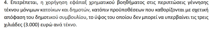 Συγκεκριμένα, και σύμφωνα με την 4η παράγραφο του άρθρου “επιτρέπεται, η χορήγηση εφάπαξ χρηματικού βοηθήματος στις περιπτώσεις γέννησης τέκνου μόνιμων κατοίκων και δημοτών, κατόπιν προϋποθέσεων που καθορίζονται με σχετική απόφαση του δημοτικού συμβουλίου, το ύψος του οποίου δεν μπορεί να υπερβαίνει τις τρεις χιλιάδες (3.000) ευρώ ανά τέκνο.”