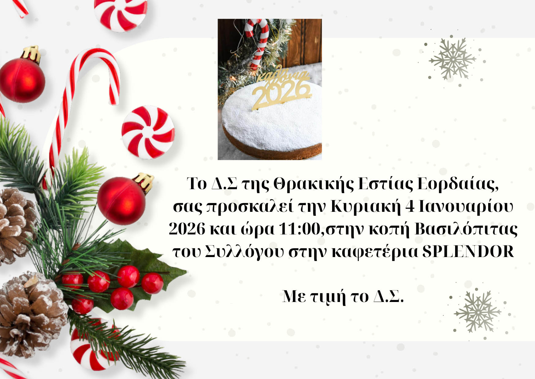 Την καθιερωμένη ετήσια εκδήλωσή της για την κοπή της βασιλόπιτας διοργανώνει η Θρακική Εστία Εορδαίας «Ο Αρχιγένης» την Κυριακή 4 Ιανουαρίου 2026, στις 11:00 το πρωί, στην καφετέρια SPLENDOR στην Πτολεμαΐδα.