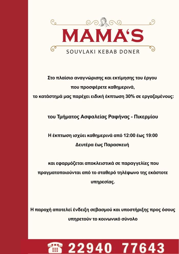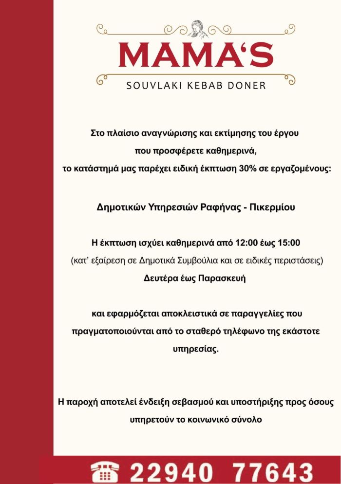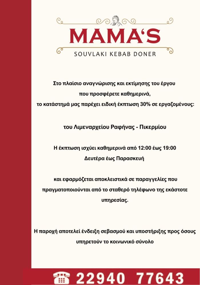 Ραφήνα: Ειδική έκπτωση 30% σε Σώματα ασφαλείας και Δημοτικούς υπάλλήλους από το Mamas – rpn
